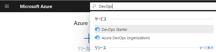 まず、 Azure Portalから検索ボックスにDevOpsと入力します。候補の一覧が表示されますので、[DevOps Starter]をクリックします。