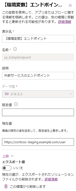 このような実装の場合には、ソリューションを別の環境に移行した際に、移行先の環境でクラウドフロー自体を編集しない限り、値を書き換えることができなくなります。