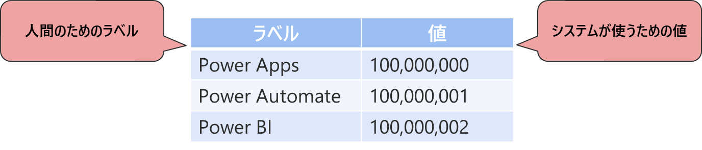 どちらも選択肢としての構造は同じになっており、ユーザーに表示されるラベルと、システムが識別するための値のセットで構成されています。