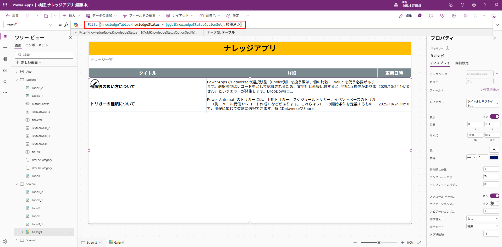 今回は、ナレッジ管理アプリを開発する中で、登録されているナレッジの中のKnowledgeStatusが「投稿済み」のデータのみをGalleryに表示するというシナリオでご説明します。