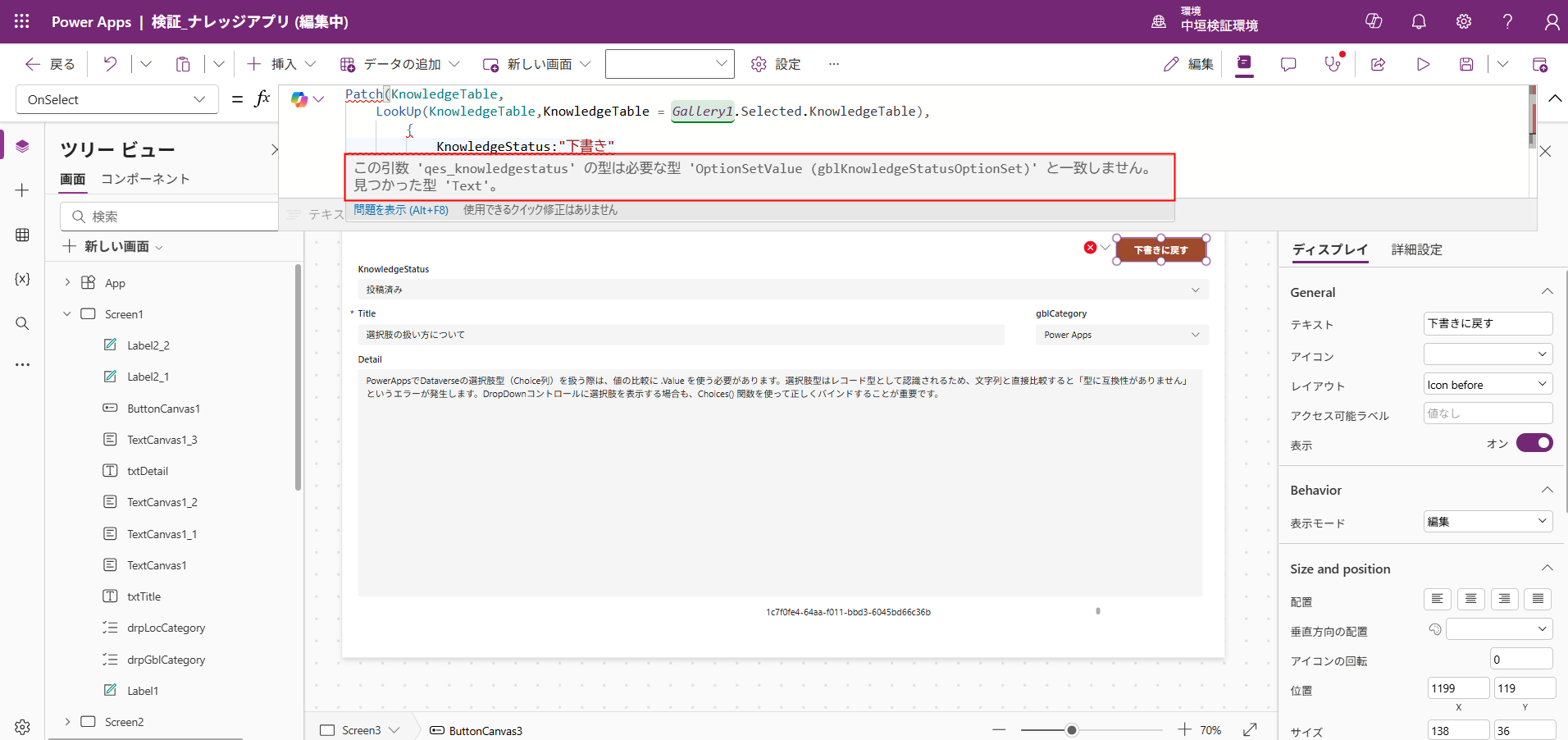 以下のように、選択肢型である「KnowledgeStatus」列に対してテキストの「下書き」で更新をしようとすると、型が違い更新が出来ないため「型に互換性がありません」とエラーが表示されます。