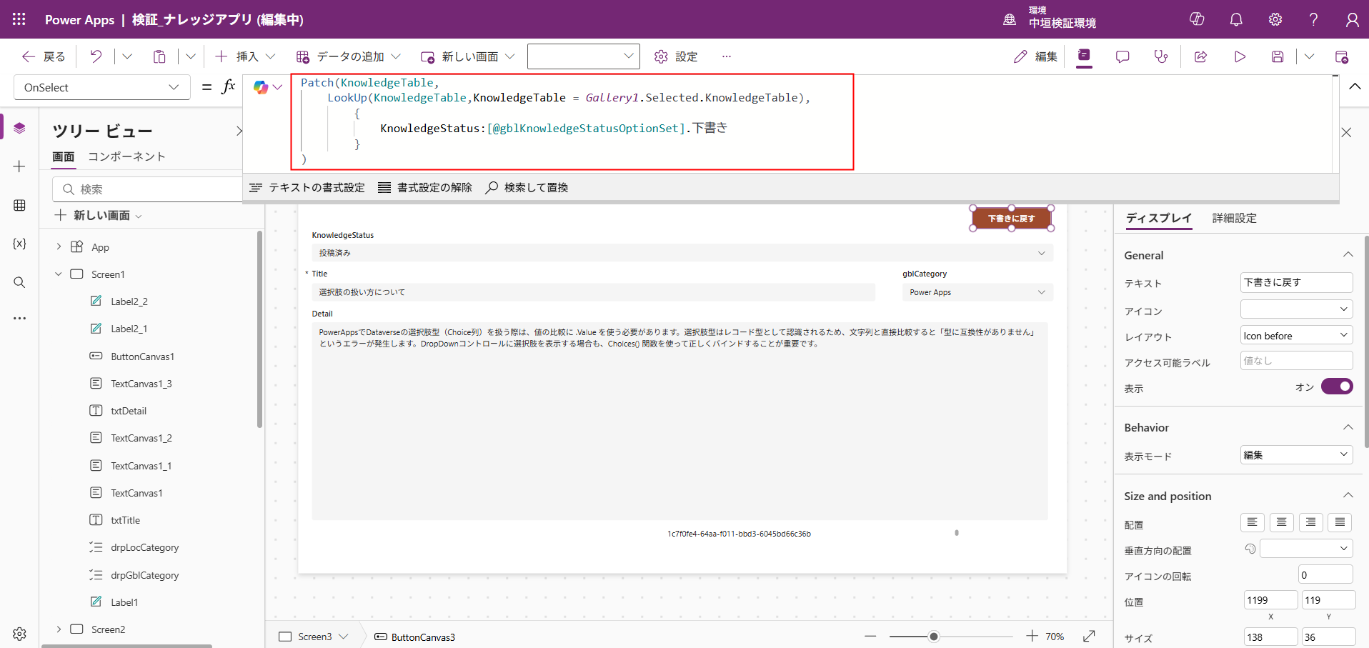 補足:「[@グローバルな選択肢のリスト].ラベル名」を設定Patch(KnowledgeTable,LookUp(KnowledgeTable,KnowledgeTable = Gallery1.Selected.KnowledgeTable),{KnowledgeStatus:[@gblKnowledgeStatusOptionSet].下書き})