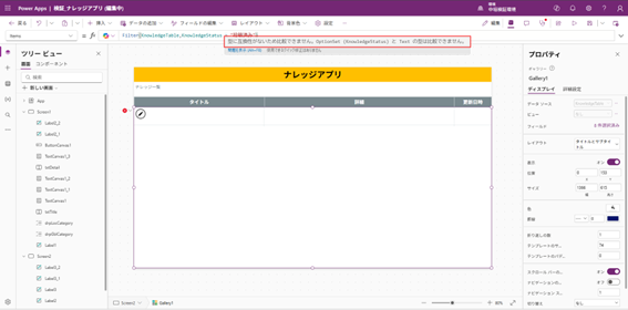 以下のように、選択肢型である「KnowledgeStatus」列とテキストである「投稿済み」を比較しようとすると、型が一致せず比較が出来ないため「型に互換性がありません」とエラーが表示されます。