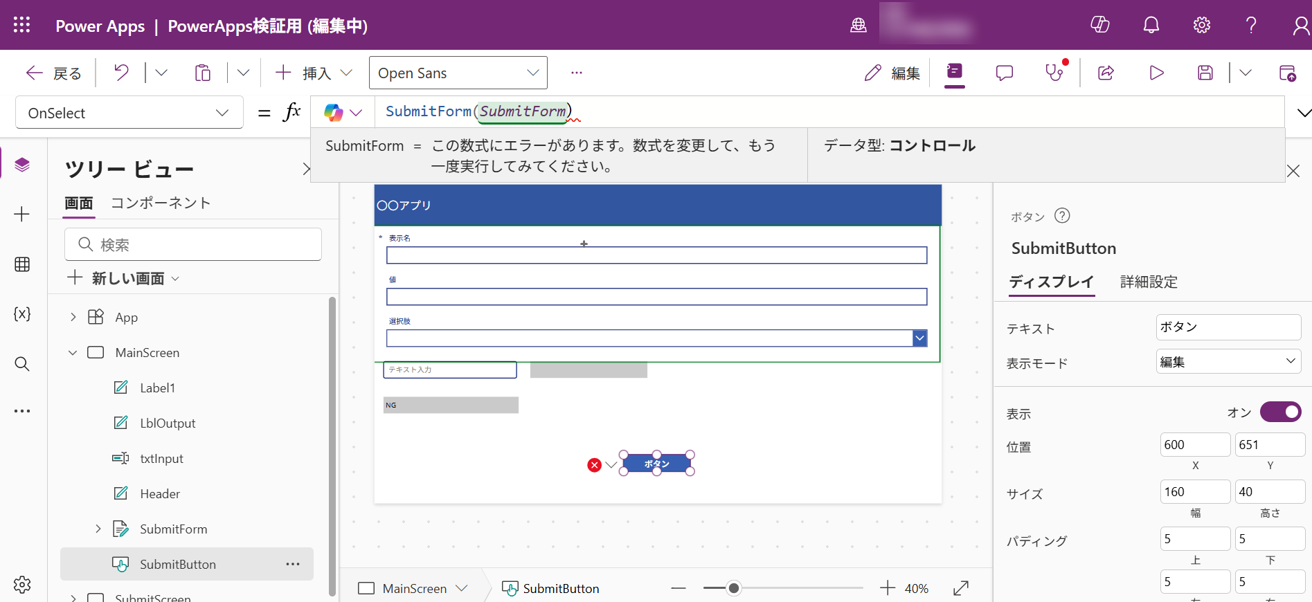 コントロールの名前(SubmitButton, txtInputなど)を数式で使う時は、「そのコントロールの『何』のデータを使いたいのか?」(色なのか、入力された文字なのか)まで指定する必要があります。