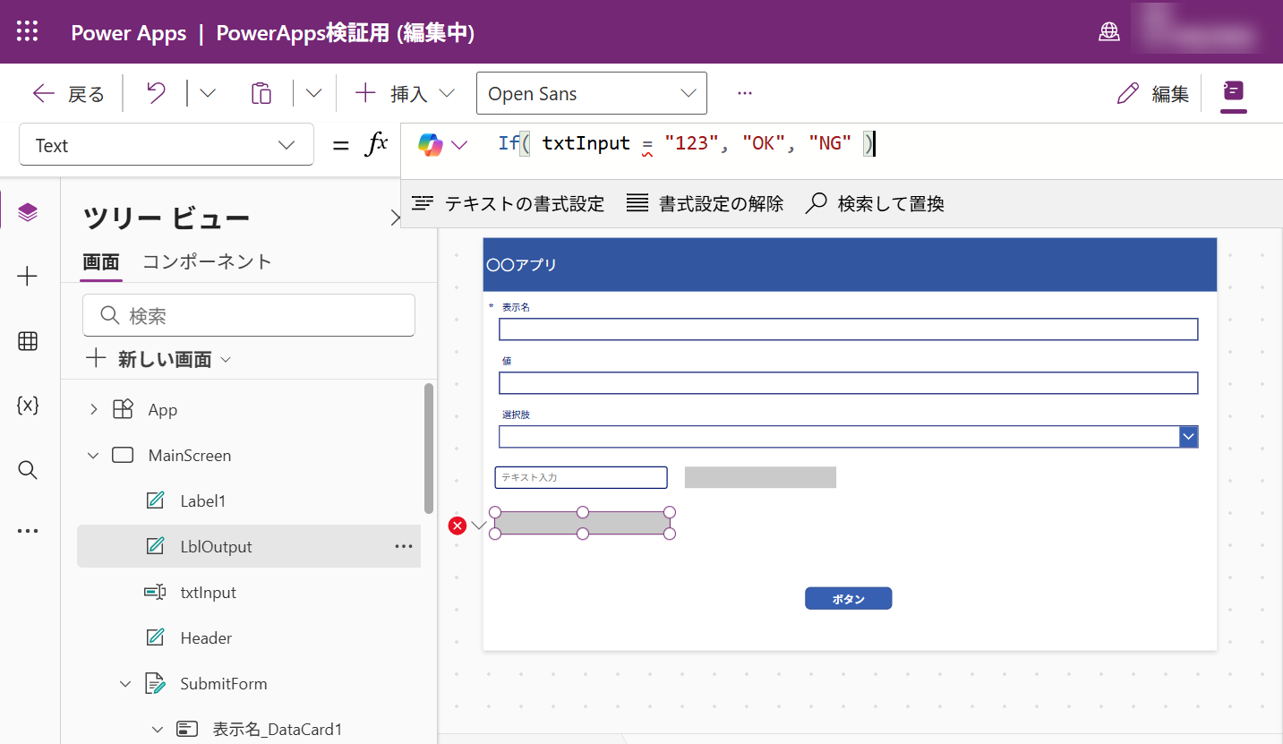 例として、「テキスト入力コントロール(txtInput)に "123" と入力されたらテキストラベル(LblOutput)に自動でOKと表示する」機能を実装します。
