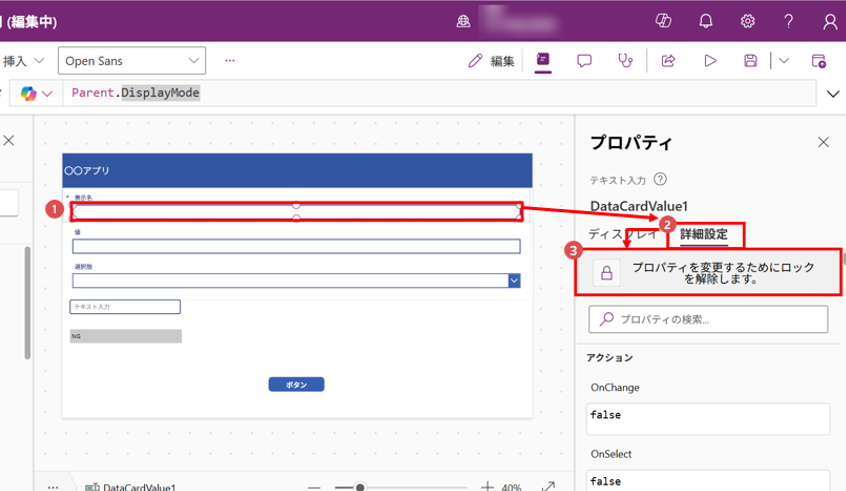 フォーム内のデータカードは、データソースと密接に繋がっているため、デフォルトでは「ロック」がかかっています。