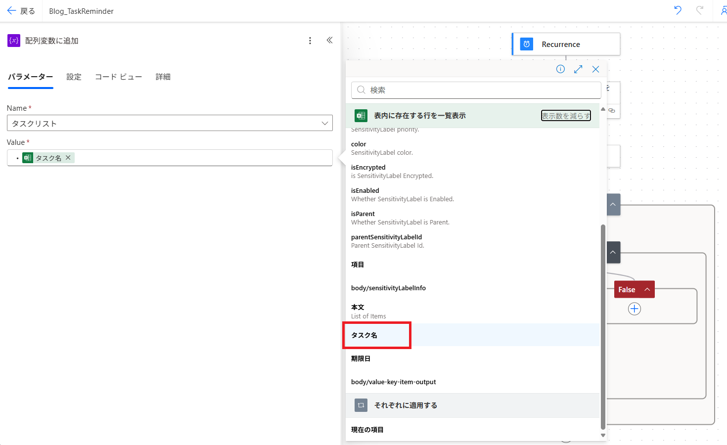 これで、ループ処理が終わる頃には、TaskList という変数の中に、今日が期限のタスク名だけがリストアップされている状態になります。