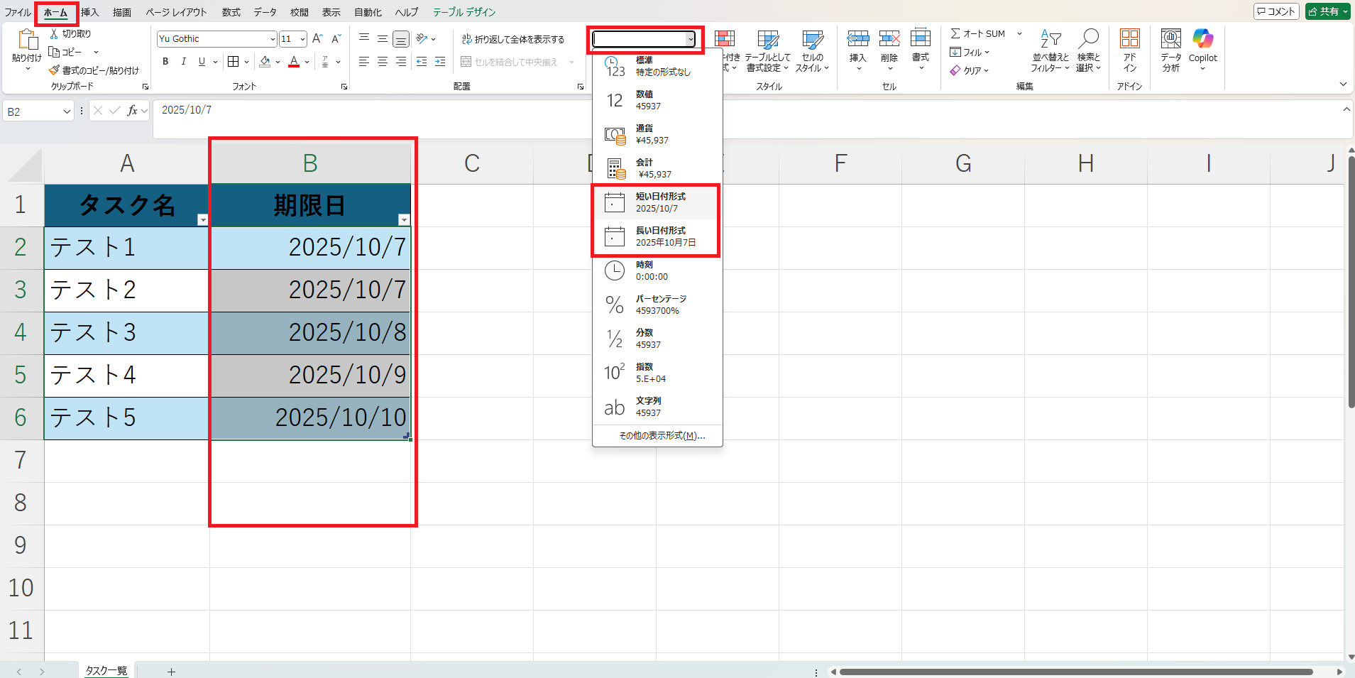 期限日 の列全体を選択し、「ホーム」タブの書式メニューから「短い日付形式」または「長い日付形式」を選びます。
