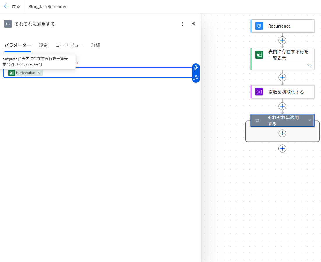 Value | 動的なコンテンツから「タスク名」を選択し、 『・@{items('それぞれに適用する')?['タスク名']}』 のように入力します。(先頭「・」は見やすくするため) |