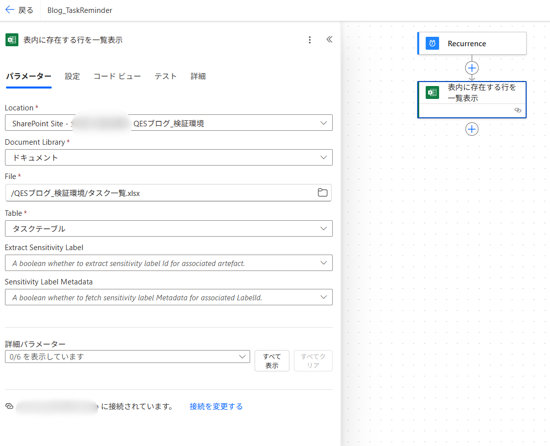 「表内に存在する行を一覧表示」アクションを追加し、各項目を以下のように設定します。