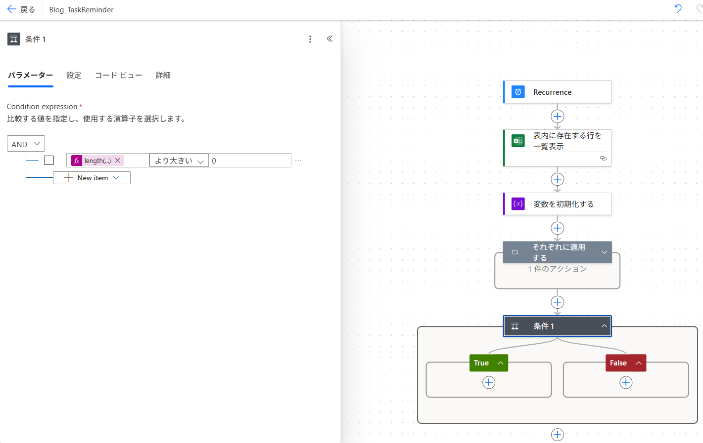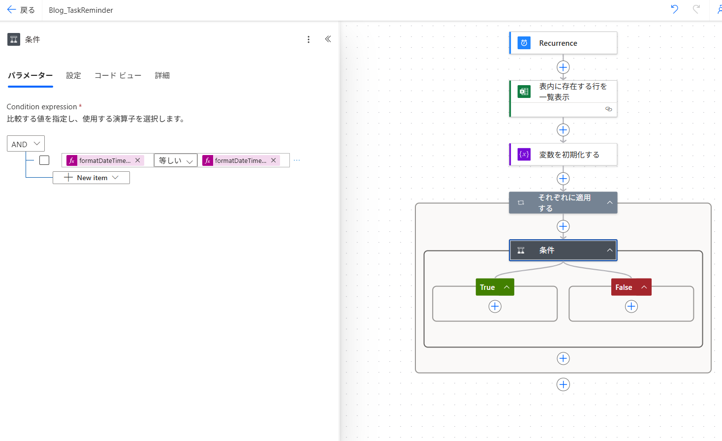 条件分岐で「はい (True)」になった場合(=期限が今日だった場合)の処理を作っていきます。