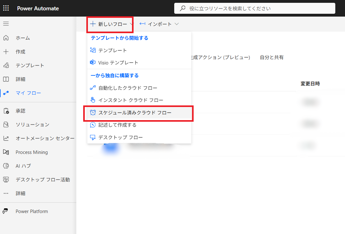 今回は「毎日決まった時間に自動で実行したい」ので、このスケジュール済みフローを使います。
