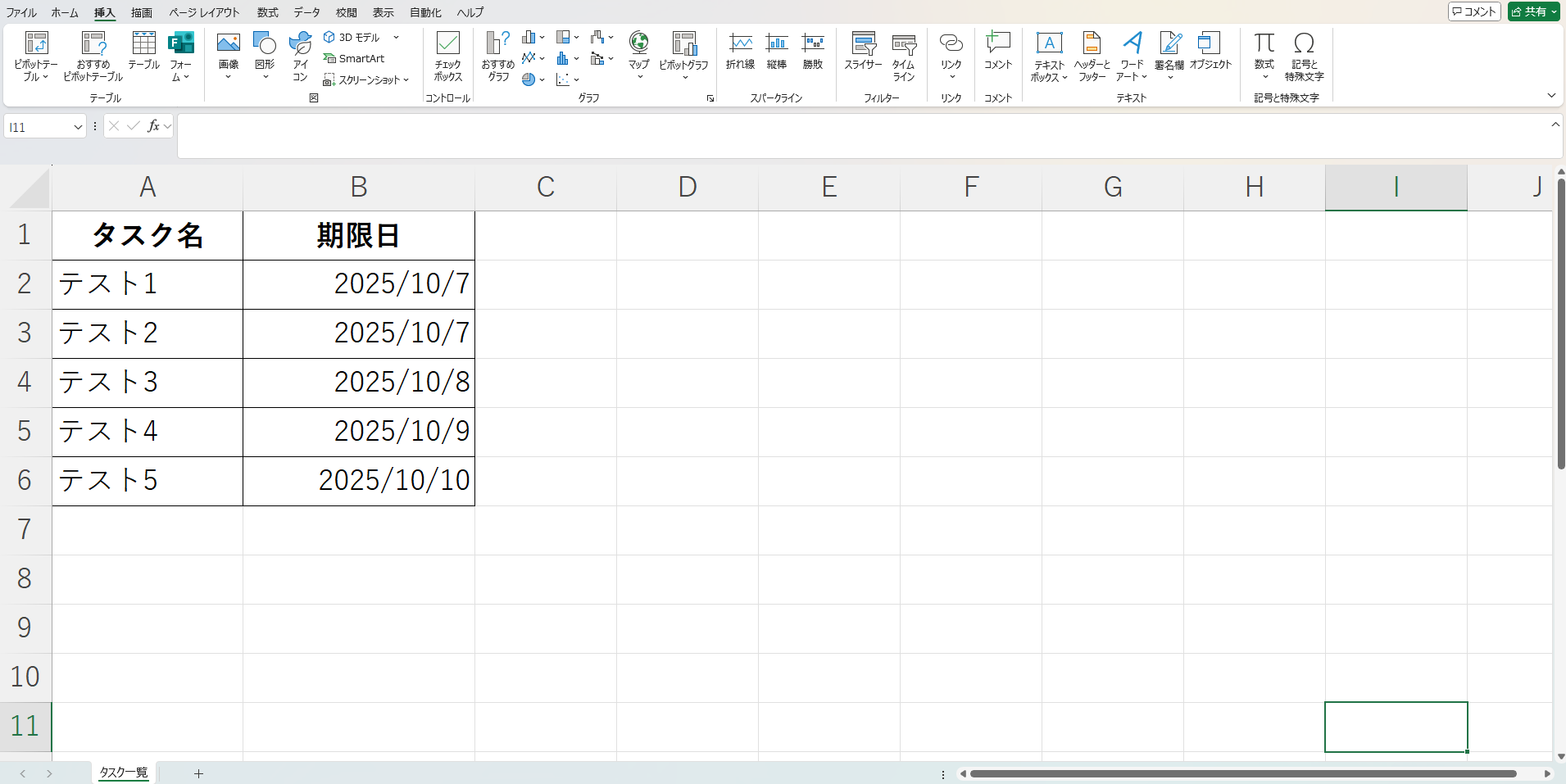 まず、タスク名、期限日 といったヘッダー(見出し行)を作り、その下に実際のタスクをいくつか入力します。