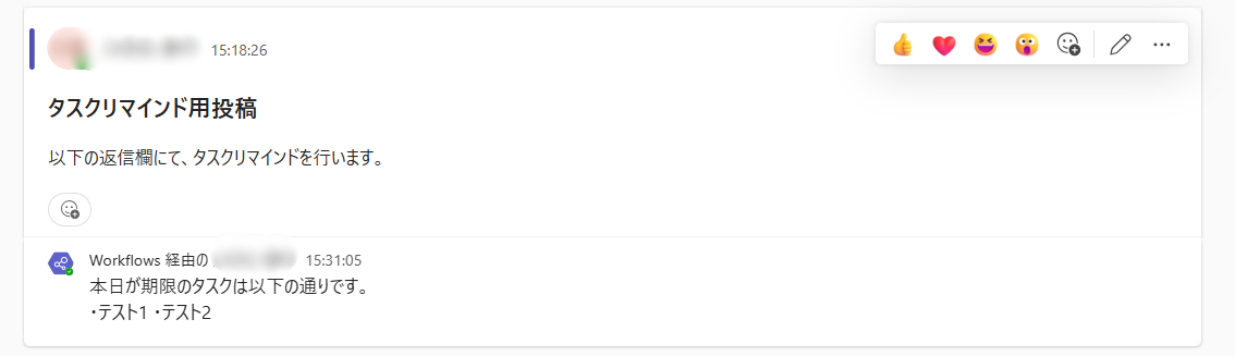 Message | 本日が期限のタスクは以下の通りです。 body('結合')(→1つ前の処理で作成したタスクリストを結合したもの) |