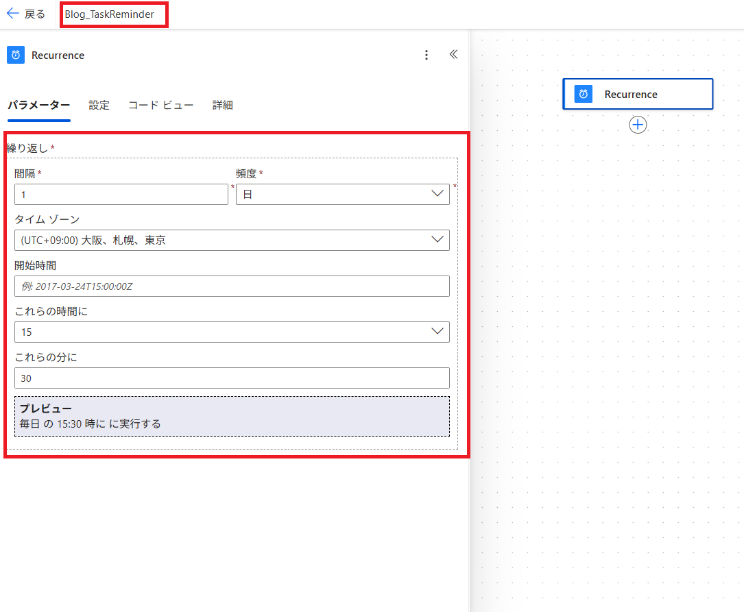 今回は、フローのトリガー(スケジュール)をフロー作成時に近い2025/10/7(15:30) に設定しました。