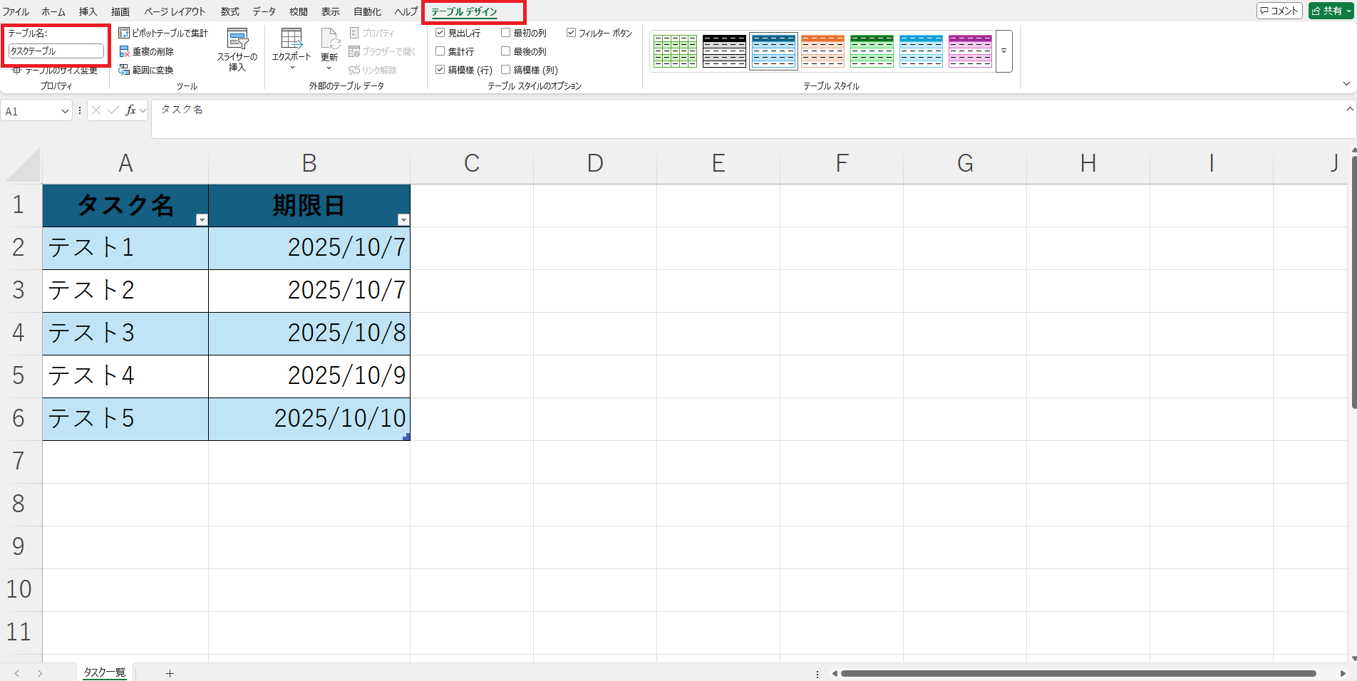 左上にある「テーブル名」を、分かりやすい名前に変更しましょう(例: タスクテーブル)。