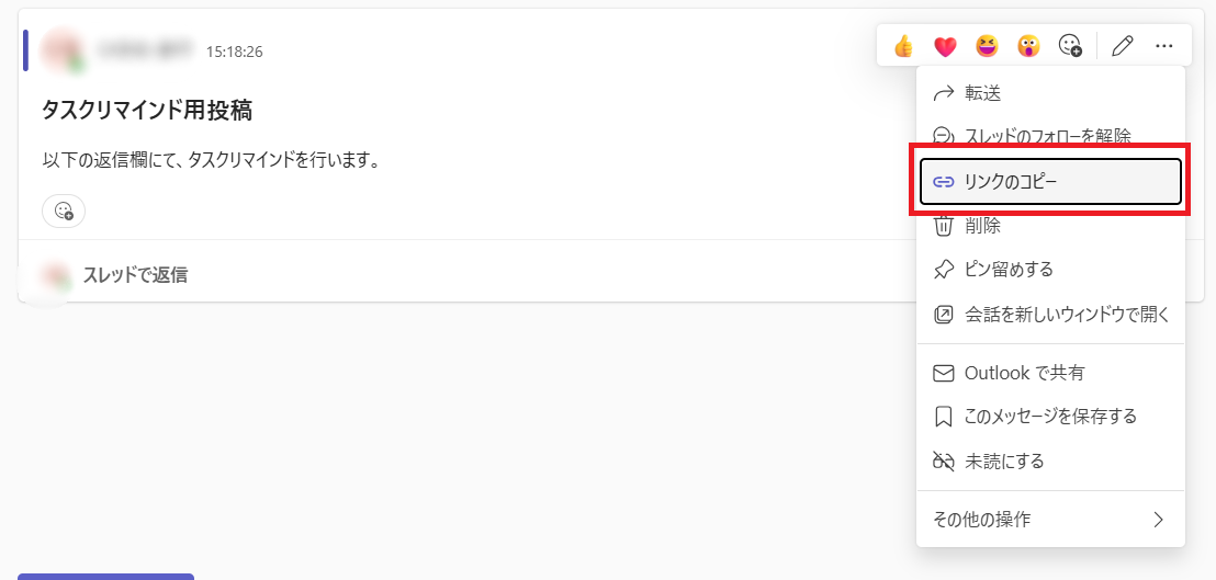 返信先にしたいTeamsの投稿の右上にある「...」(その他のオプション)をクリックし、「リンクをコピー」を選択します。