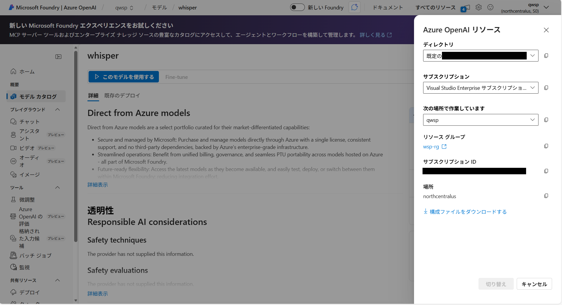 ②Microsoft Foundry(Foundry Tools)からWhisperのデプロイを作成し、リソースの「ターゲットURI」「キー」「デプロイ名」を控えておきます。