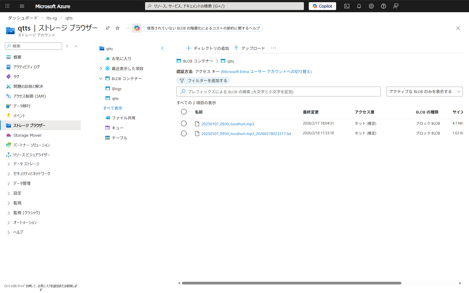 BLOBストレージに用意したコンテナへ、オーディオファイルをアップロードして、暫く待つと、テキストファイルが作成されます。