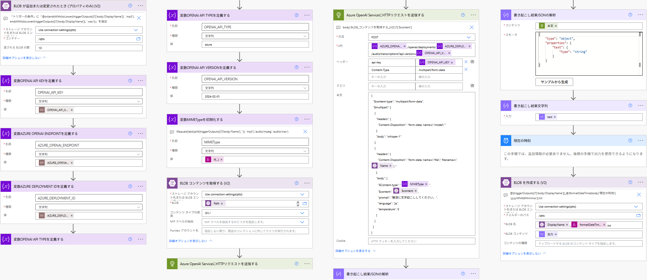ユーザーがBLOBストレージにオーディオファイルをアップロードしたことをきっかけに起動して、アップロードされたファイルの内容(オーディオデータ)を取得して、それをAzure OpenAI Serviceに送信して結果をBLOBストレージに格納するPower Automateクラウドフローです。