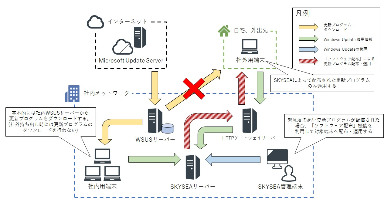 このような場合、基本的にはWSUSサーバーから更新プログラムのダウンロードを行い、緊急度の高いパッチが配信された時のみSKYSEAの「ソフトウェア配布」機能を利用する、といったことも可能です。