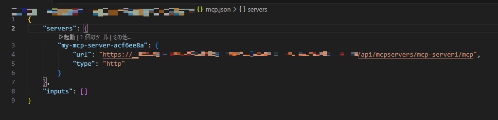 入力が終わると、mcp.jsonファイルに入力した内容でMCPサーバーが登録されていますので「起動」しておきます。