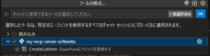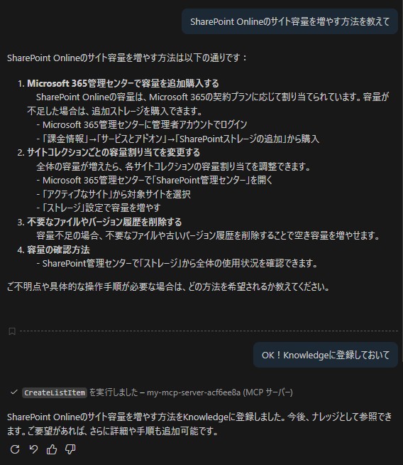 ざっくり言うと、「AIと外部ツール(社内システムやデータ)をつなぐための共通規格」です。これを使うことで、AIがチャット画面から直接データベースを検索したり、今回のようにSharePointに書き込みを行ったりできるようになります。