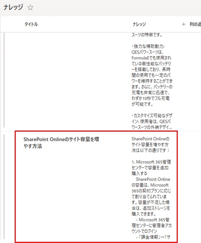 定義したJSONスキーマの Title、Knowledge を、SharePoint側の「タイトル」と「ナレッジ(本文)」列にそのままマッピングします。