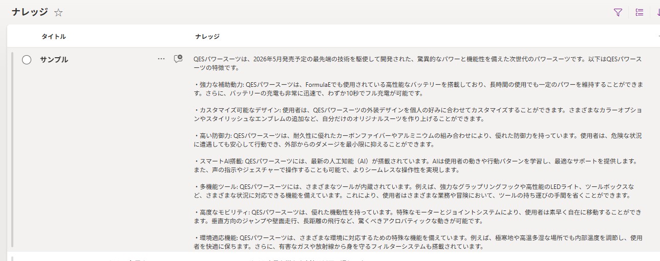 ナレッジには「QESパワースーツ」という仮想の製品の情報が登録されています。
