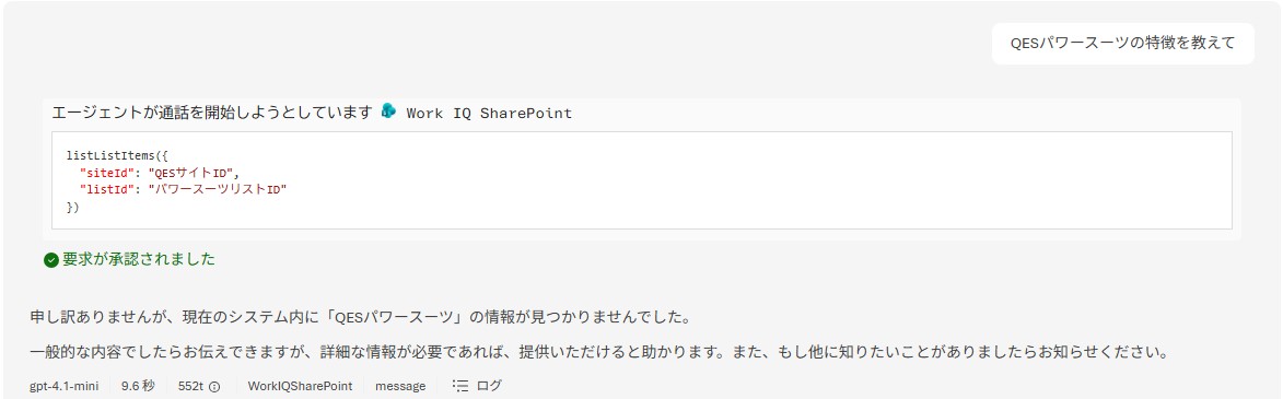 「QESパワースーツ」に対する質問を行ってみると、以下のようにAIがWork IQ SharePointを使用して製品情報を探そうとしてくれます。
