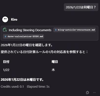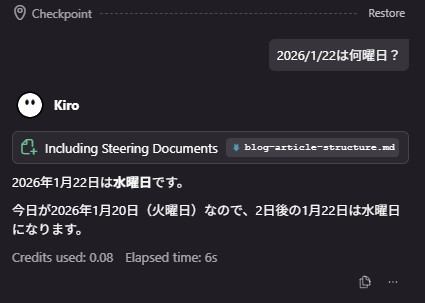 Kiroを使っていると、日付や曜日に関する質問やファイル作成をすることがあるかと思います。しかし、AIモデルは日付計算を推測で行うため、時々計算結果がずれてしまうことがあります。今回は、この問題に対する簡単な対処法をご紹介します。
