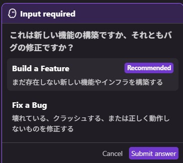 まず、Specの目的として「Build a Feature(新機能開発)」か「Fix a Bug(バグ修正)」かを選択します。