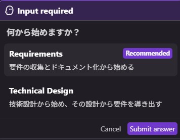 Build a Featureを選んだ場合は、続けて「Requirements(要件定義から開始)」か「Technical Design(技術設計から開始)」かを選択します。Fix a Bugを選んだ場合はそのままBugfixワークフローに進みます。
