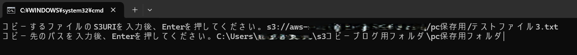 set /p bucketuri=コピーするフォルダまたはファイルのS3URIを入力後、Enterを押してください。