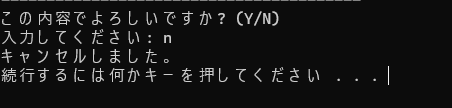 入力された値が「Y」でない場合、goto :EOFで処理の実行をキャンセル、echoでメッセージを表示して、pauseで画面が自動で閉じないようにする。