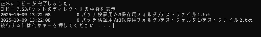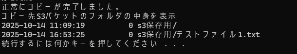 aws s3 ls コマンドで、コピー先のS3フォルダの中身を表示する。