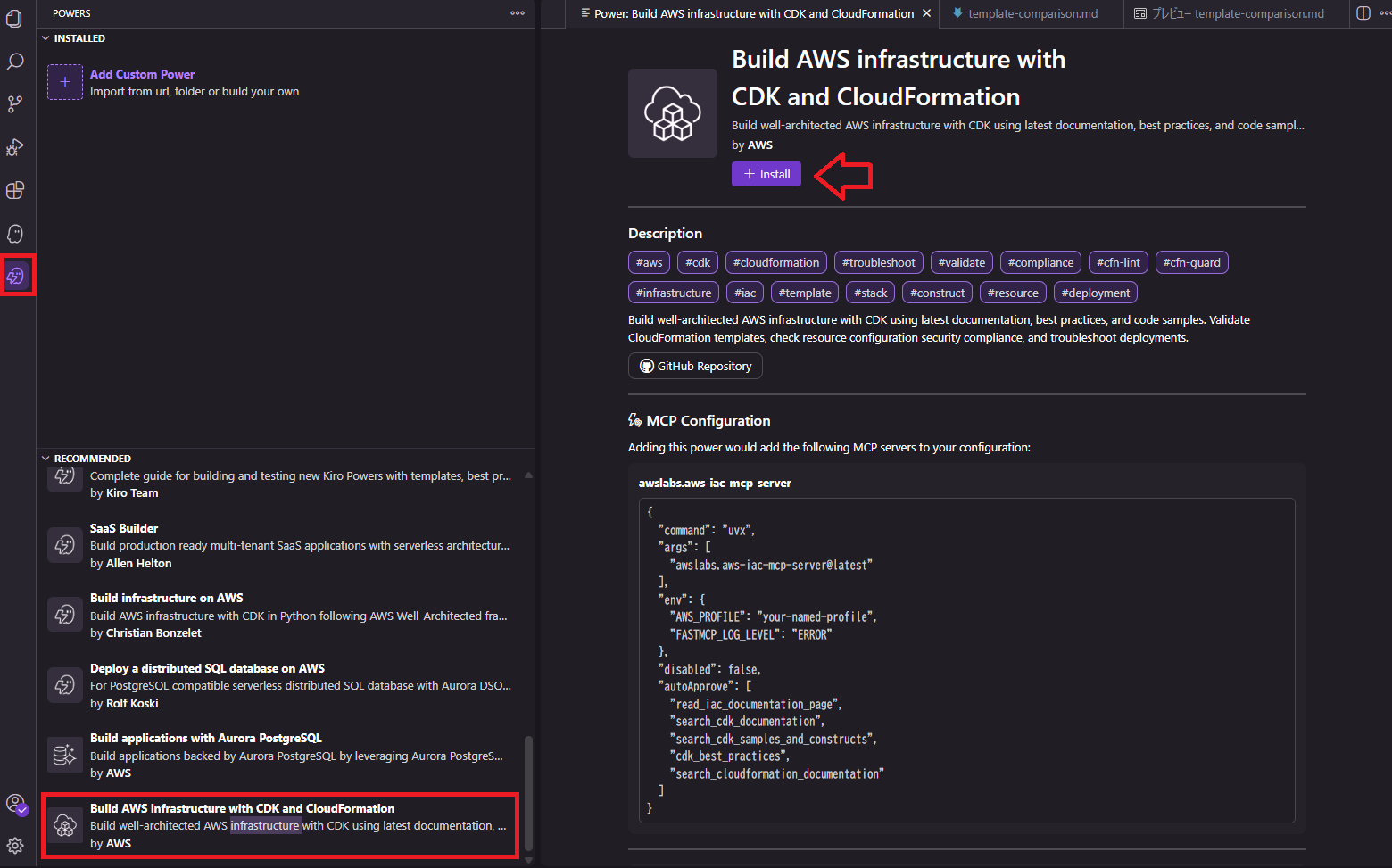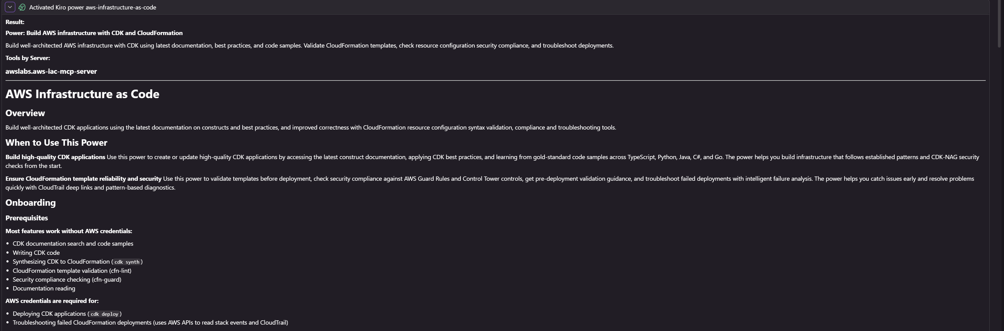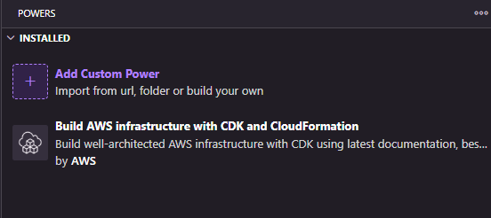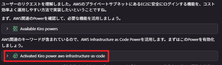 ①「aws-infrastructure-as-code」という名前の拡張機能(Powers)がオンになったこと
