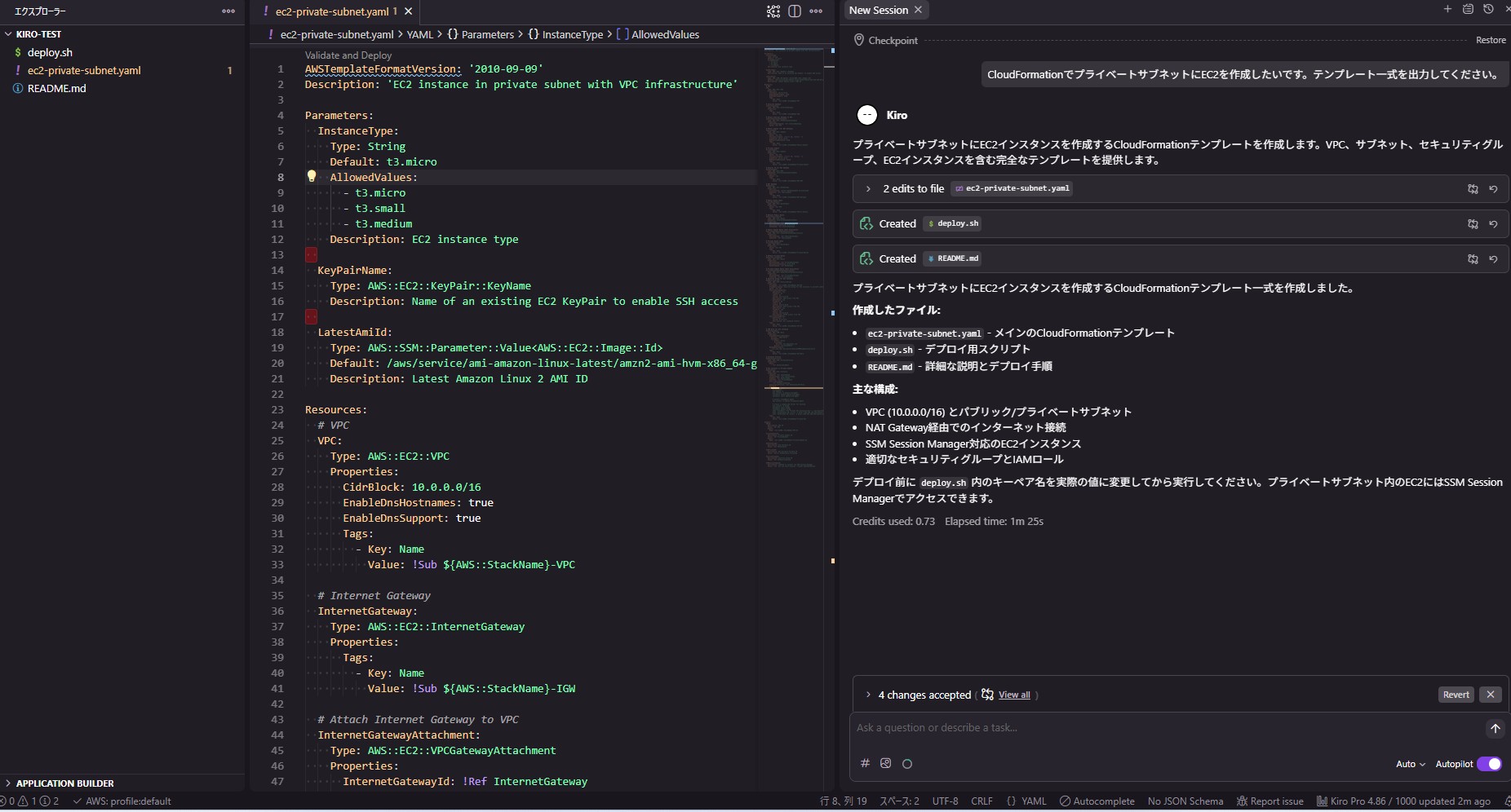 KiroはVisual Studio Code (VS Code) を基盤としており、多くのユーザーに馴染み深い環境を維持しつつ高度なAI機能を活用することができます。