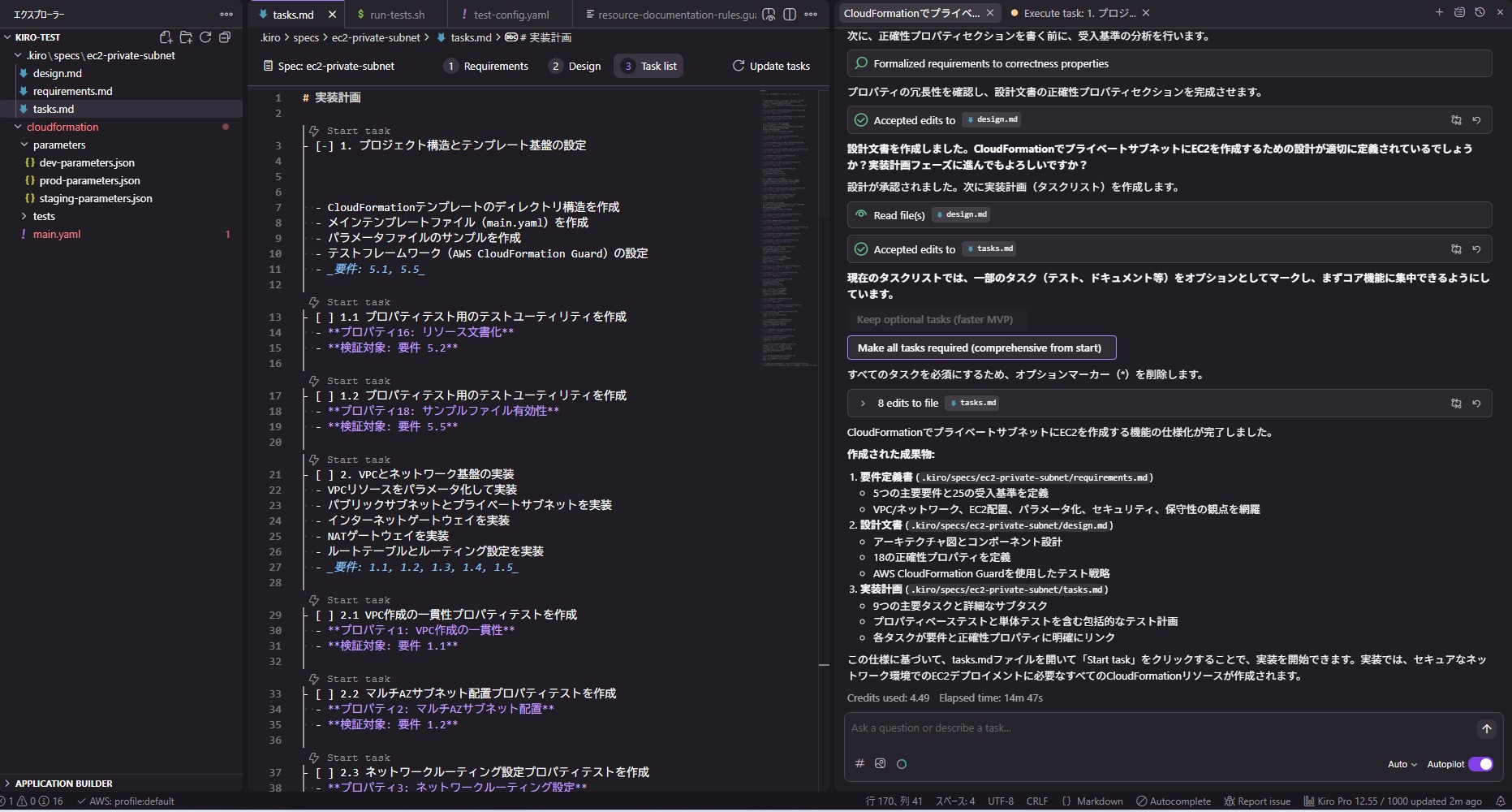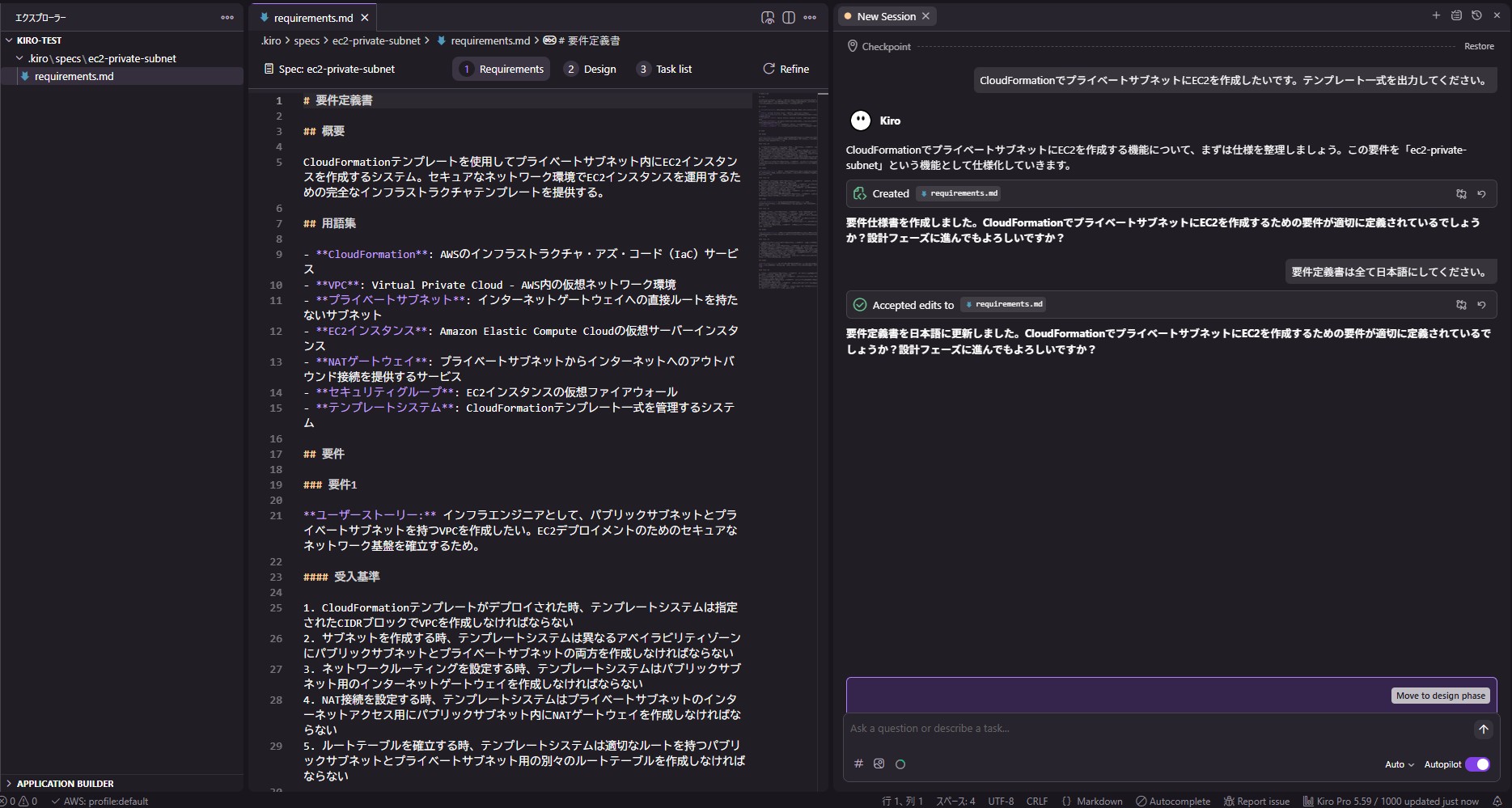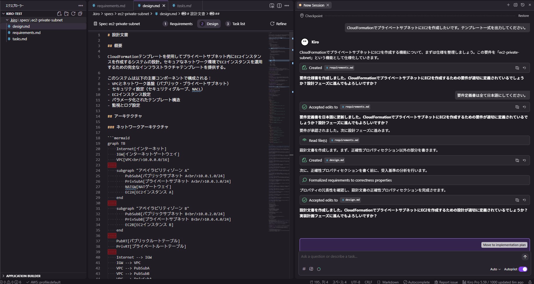 - AI (Kiro): 要件定義から設計、タスク分解まで、開発の上流工程を担う「アーキテクト」兼「プロジェクト管理者」としての役割。