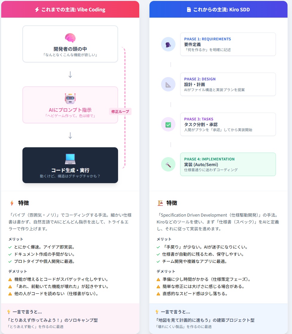 | 要素 | 仕様駆動開発(SDD, Kiro Specモード)の優位性 | プロンプト駆動開発(バイブコーディング)の課題 |