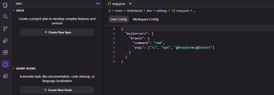 最初にKiroの設定ファイルに、draw.io MCPサーバーを起動するためのJSONコードを追記します。