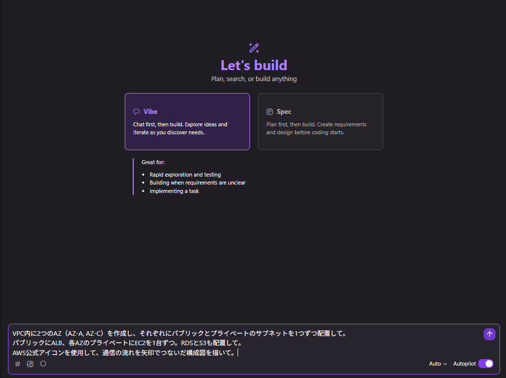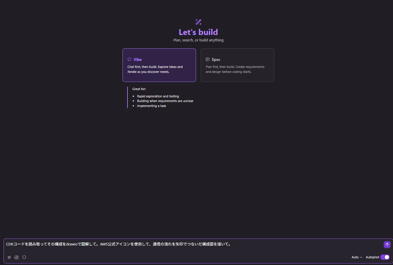 まずはKiroのVibe機能を使用して、自然言語でAWSの構成図が作成できるか下記の指示を出します。