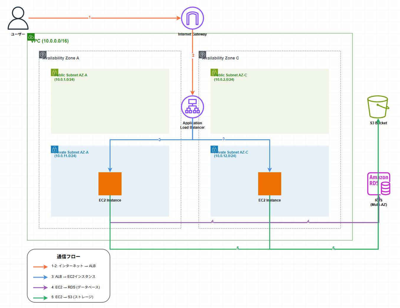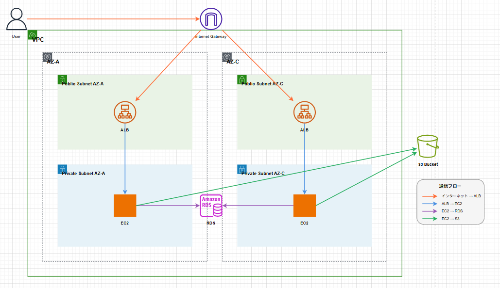 パブリックにALB、各AZのプライベートにEC2を1台ずつ。RDSとS3も配置して。