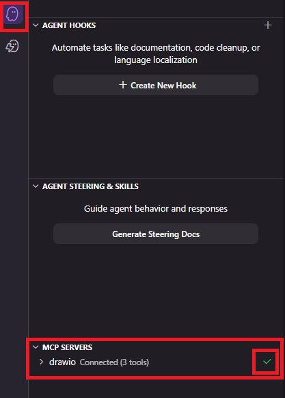 貼り付けが完了したら、Kiroアイコンをクリックします。MCP SERVERSを見てみると、draw.ioが適用されています!