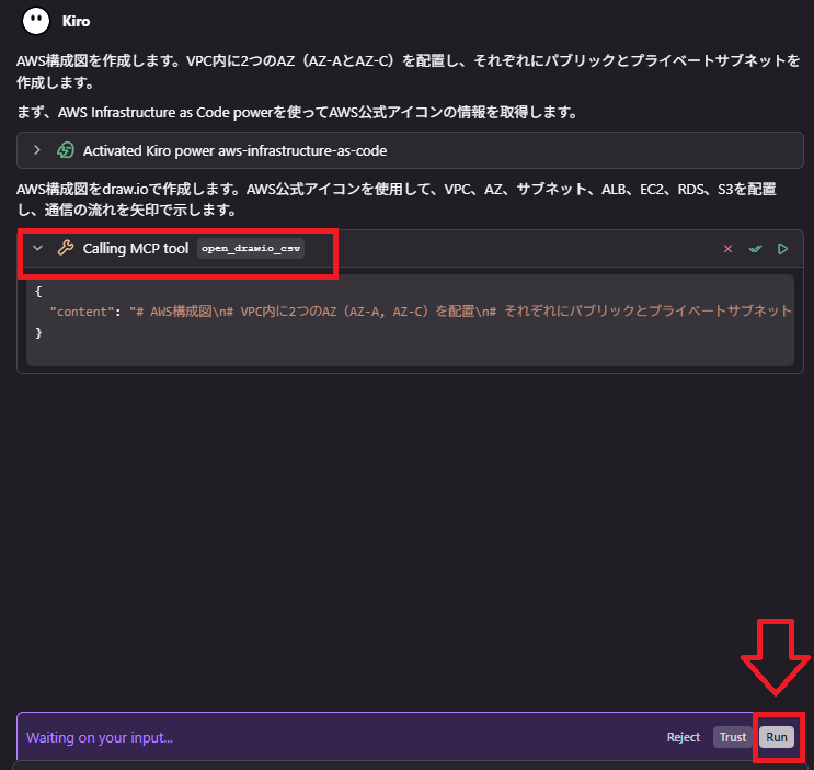 自然言語で指示した際と同様にMCPサーバーが起動し、「Run」が表示されました。「Run」を選択すると、同様にdraw.ioのブラウザが自動で開き、構成図が表示されました。