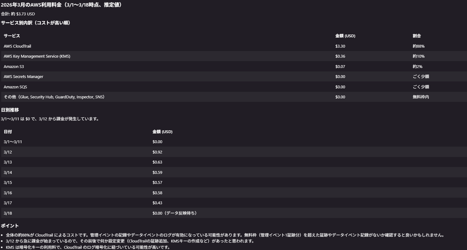 すると、Kiroが直接AWSから最新のコストデータを取得し、分かりやすく要約してくれます。