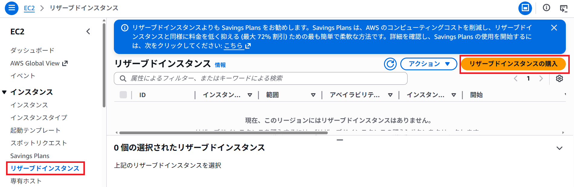 | Savings Plans | Billing and Cost Management またはEC2→ Savings Plans | 金額ベースの契約で柔軟性が高い。条件付きで返金可能。 |
