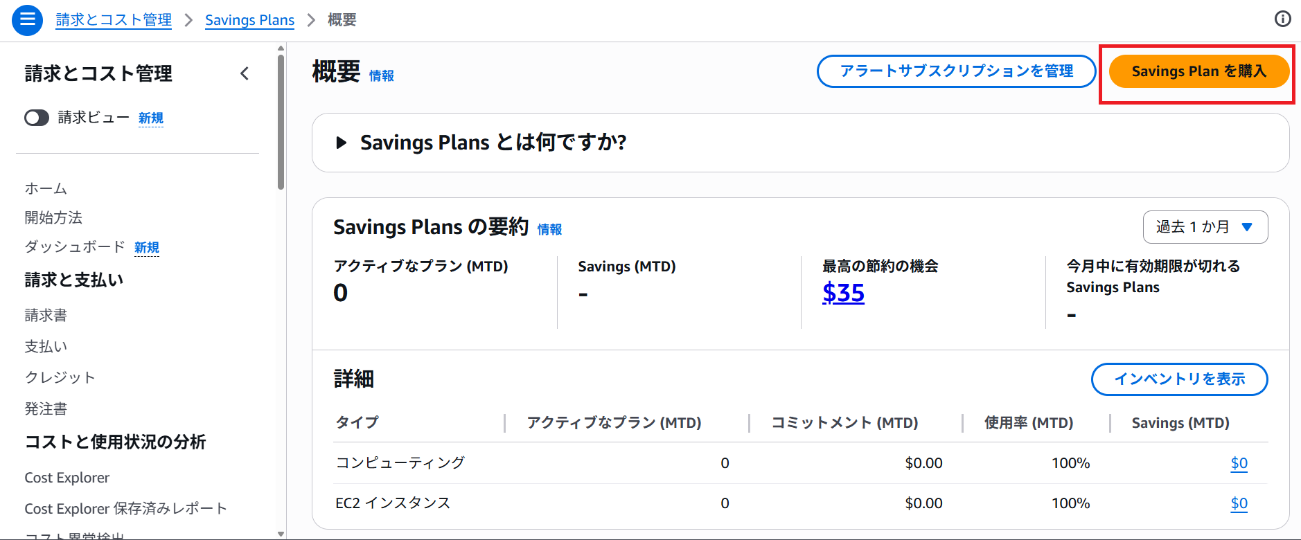 - 左側メニューから「Savings Plans」→「Savings Plansを購入」を選択します。