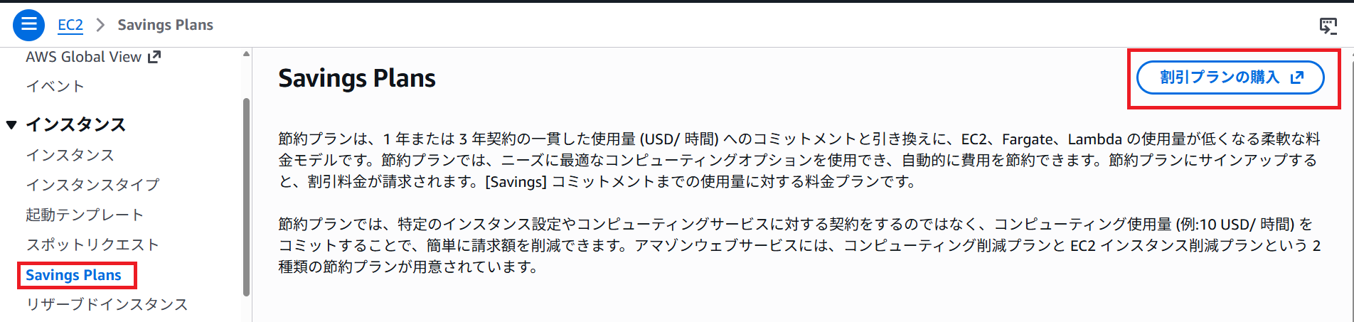 EC2の左側メニューにある「Savings Plans」から「割引プランの購入」ボタンをクリックすると、同じ購入画面にアクセスできます。