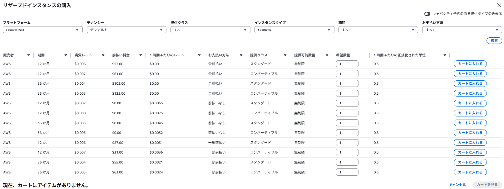 - RIは購入後のキャンセルができません。購入条件(インスタンスタイプ、期間、支払いオプション)を確認してから購入してください。